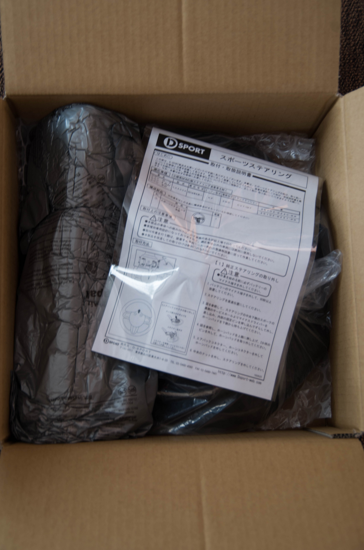取付・取扱説明書と緩衝材とステアリング。